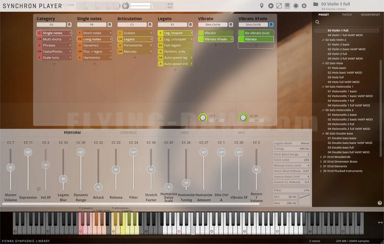 它包括了正常交响乐编制的大型弦乐群奏库、室内乐小型弦乐群奏库、弦乐独奏库、